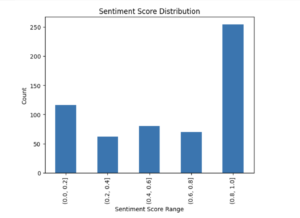 From the bar chart that has been divided into five segments, we can conclude the positive views occupy the mainstream with about 250 pieces of them scored (0.8,1.0]. However, there are also numerous of them that show negative sense, for approximately 200 pieces ((0-0.4]) .(this model uses a different scoring system, 0 represents negative and 1 represents positive, the closer to the Endpoint the stronger the emotion is.)