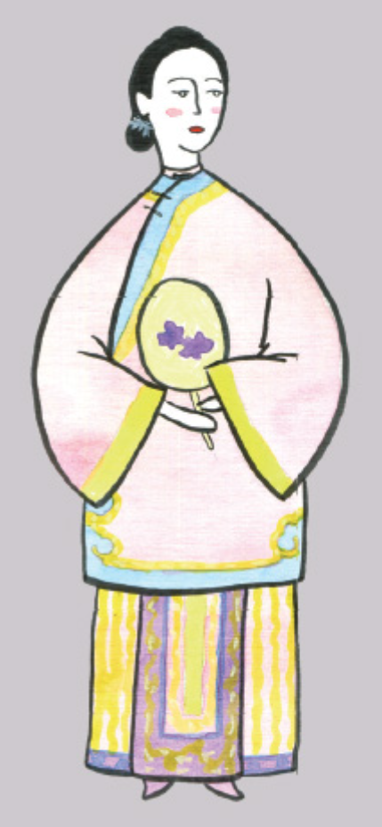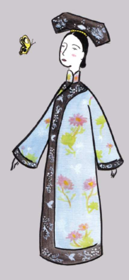 This garment is based on the Manchu robes, but with a tighter fit, shorter sleeves that reach the elbows, and a skirt length that falls to the lower leg.