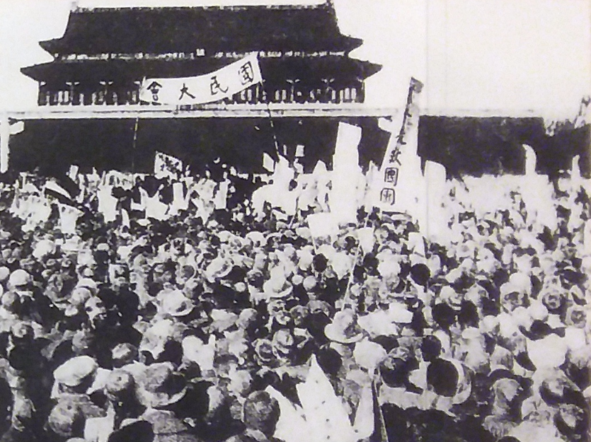 Female students wearing male-style robes in the parades of the May Fourth Movement to demonstrate gender equality.