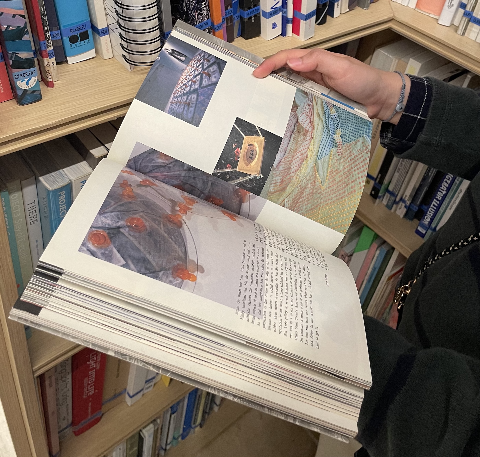 A close up shot of hands hold up a book on Korean art amidst shelves in Asia Art Archive (Source: Yannie 2025).