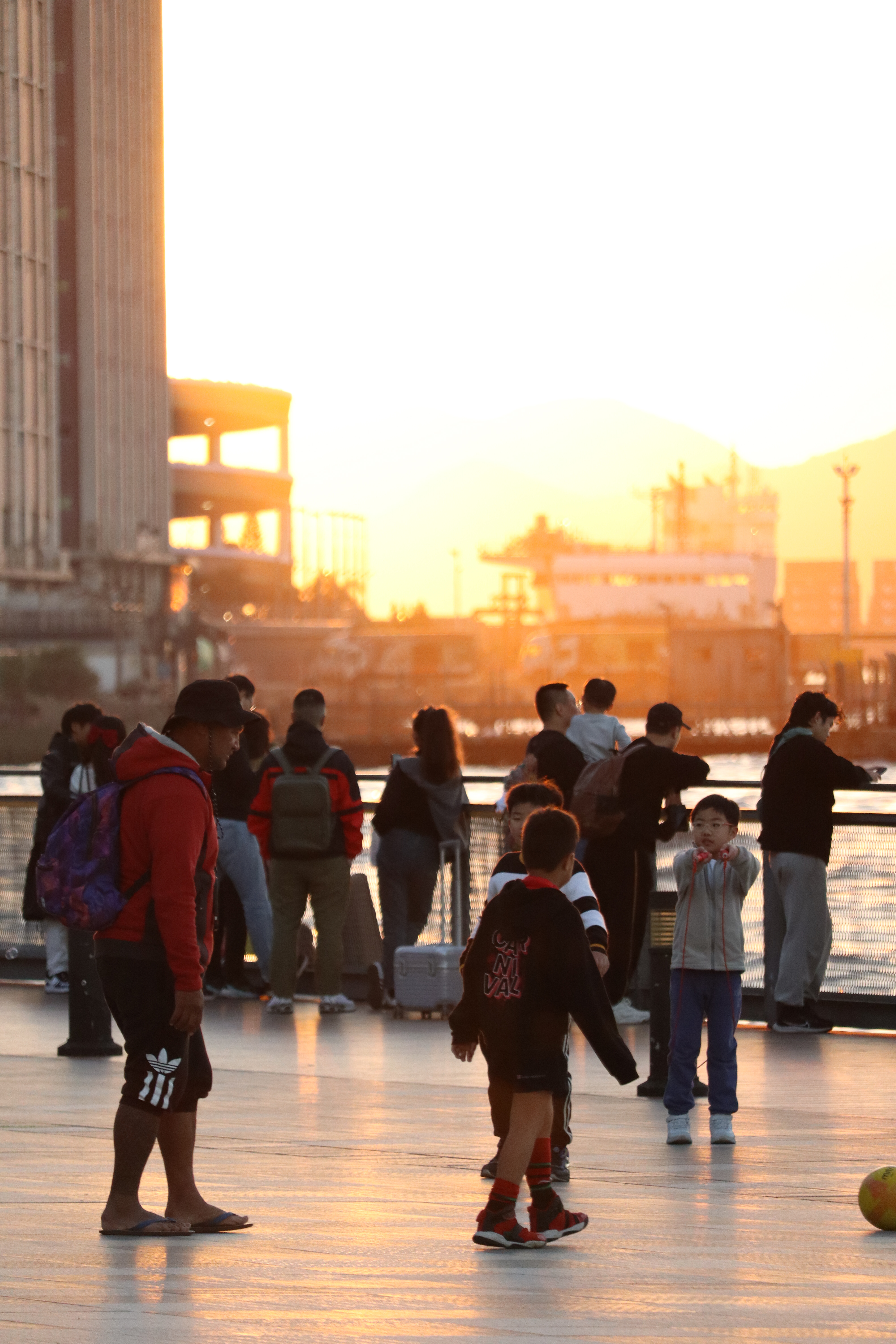 As the New Year is approaching, the number of tourists at the Victoria Harbour waterfront is gradually increasing, many people bring their families and children to Victoria Harbour to enjoy the beautiful dusk seascape and iconic sailboats, this warm moment was recorded by me through my mobile phone and camera.