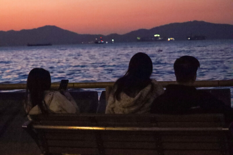 Three tourists leaning on a bench to enjoy the blues moment before nightfall in Victoria Harbour(Photo by Deng Chen/2025)