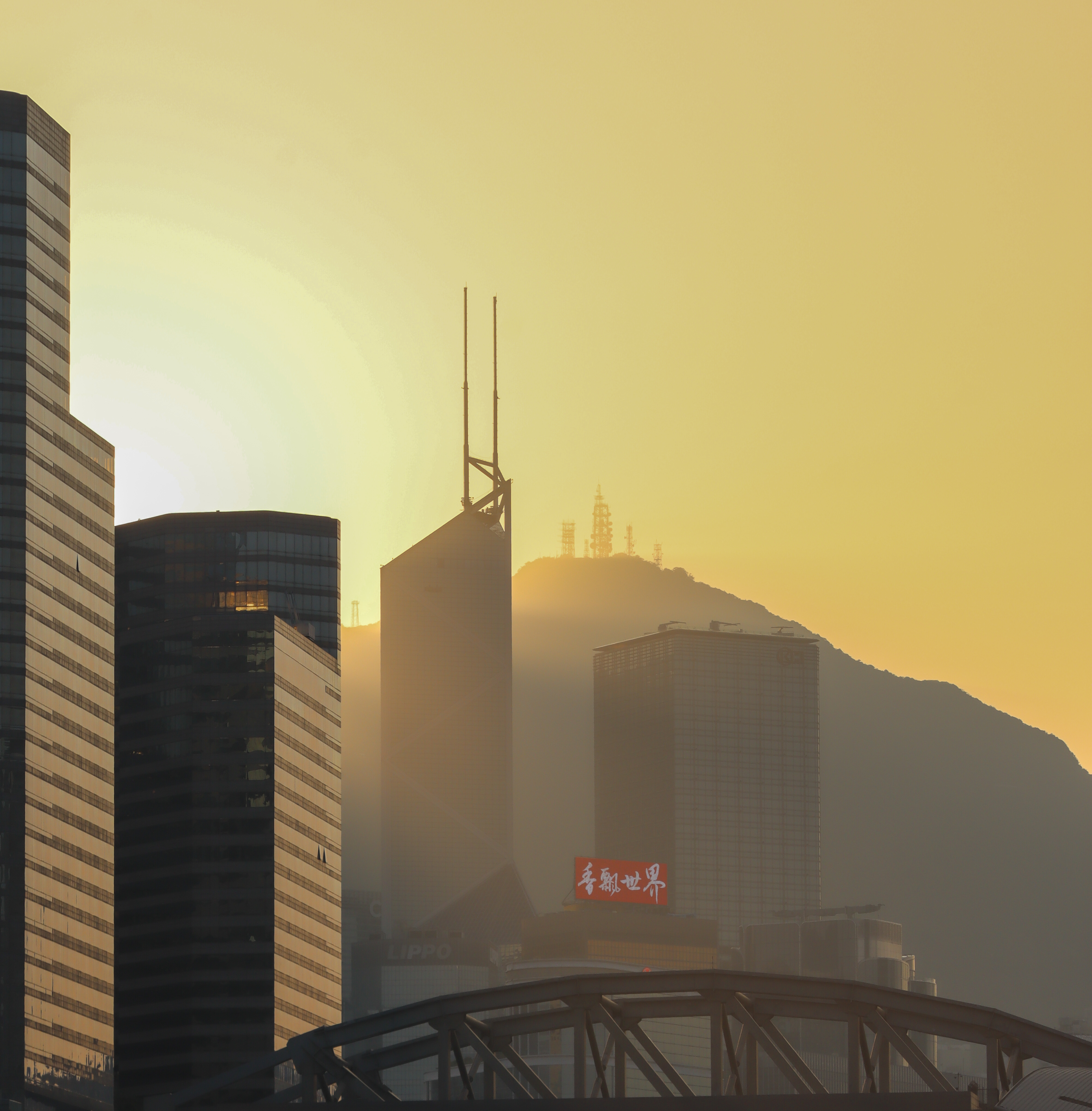 A medium shot of iconic buildings on the shore of Victoria Harbour at dusk(Photo by Deng Chen/2025)