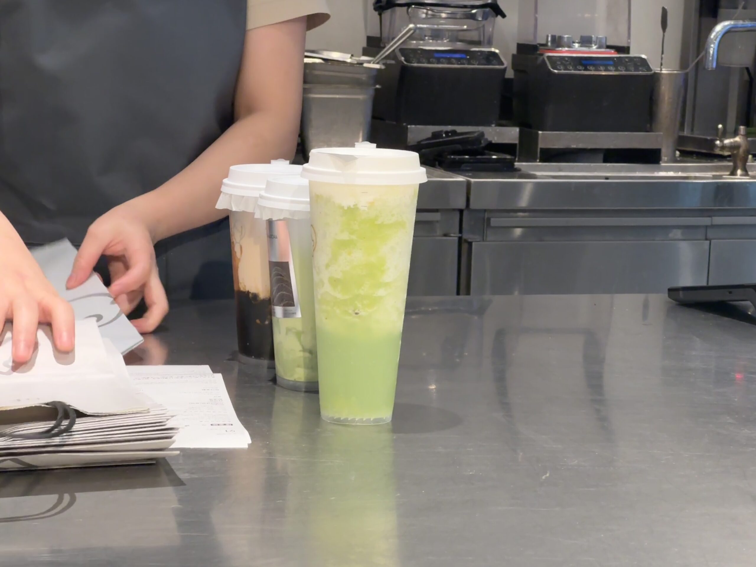 A close up shot of a clerk hands finished drink to customer. Photo: Molly