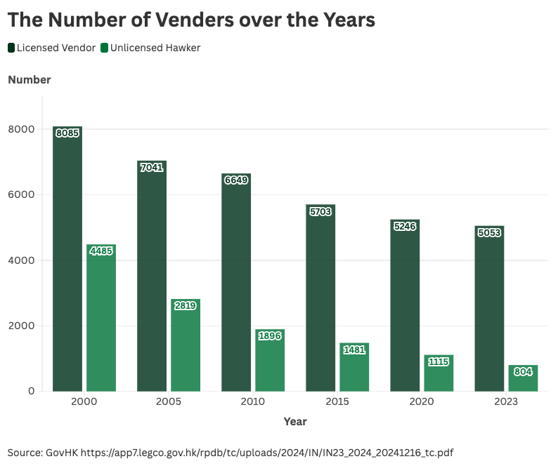 As consumer’s preferences shift, Pai-Tongs have lost much allure. Compounded by tightened management policies to stalls, licensed hawkers plummeted by 38%—from 8,150 in 2000 to 5,053 in 2023, according to data from the Legislative Council Secretariat’s Research Office.