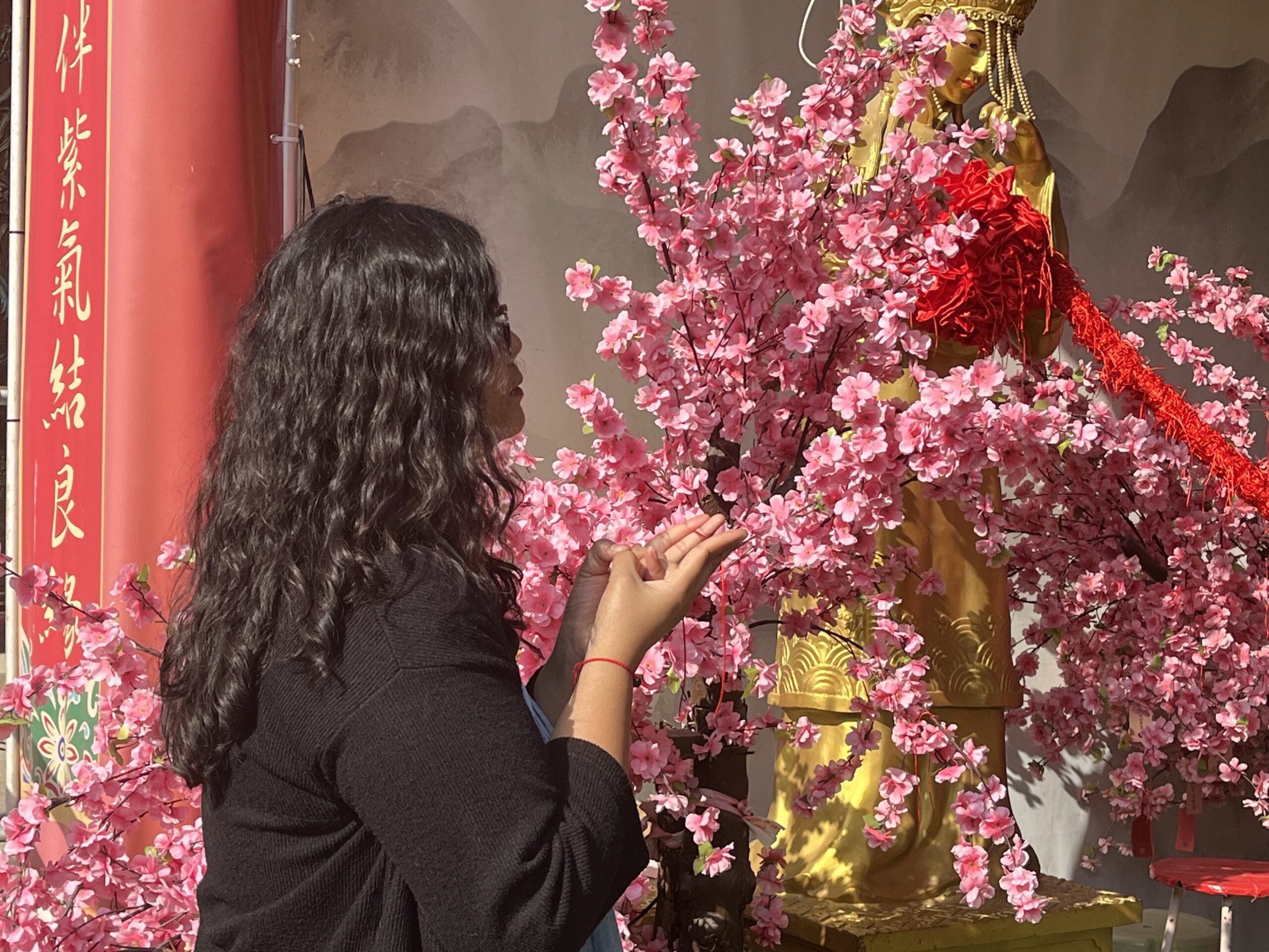 Single people pray for marriage in the Yue Lao Hall by using a special gesture to hold a red string. (Source: Xinyue Tang)