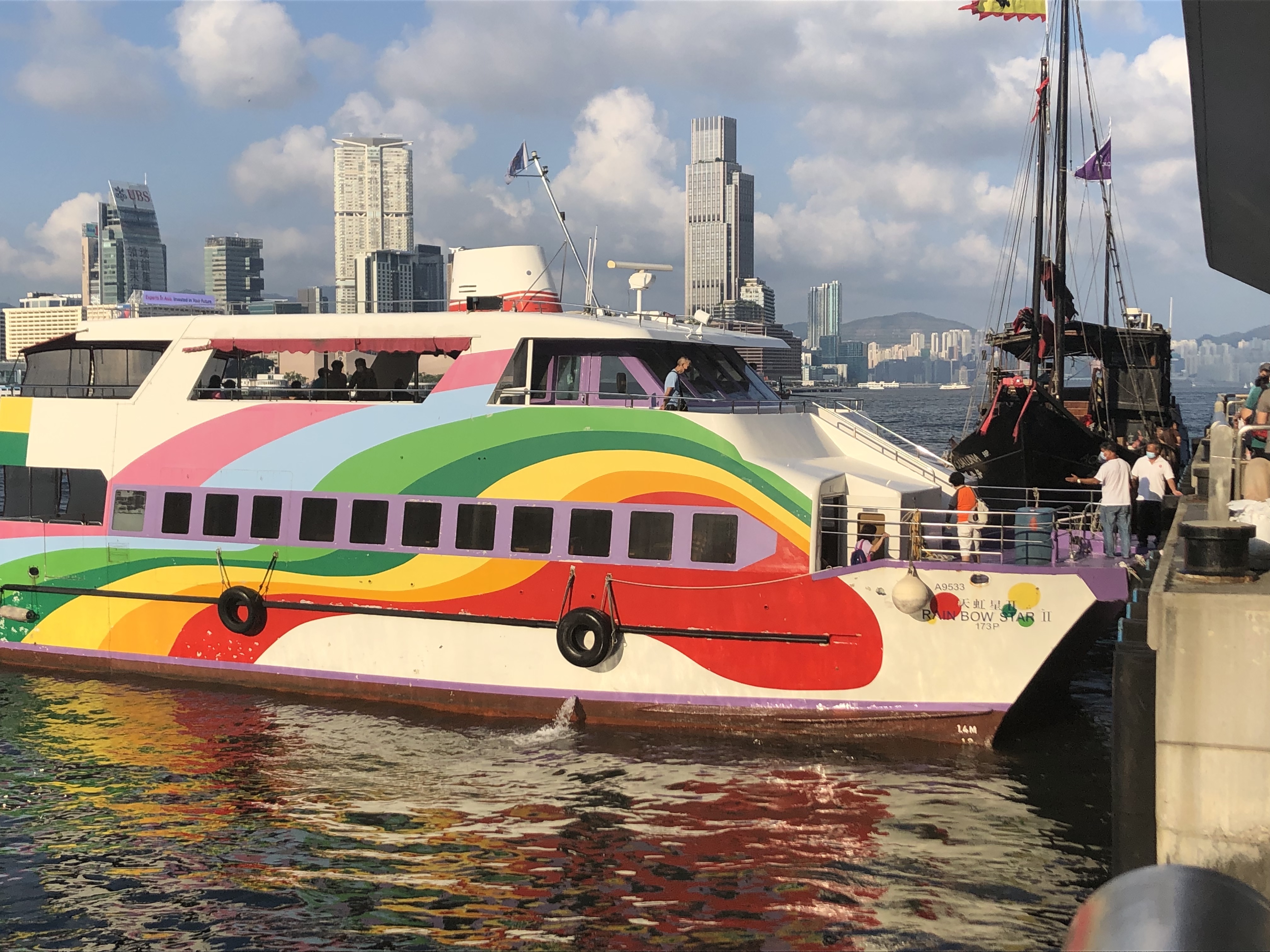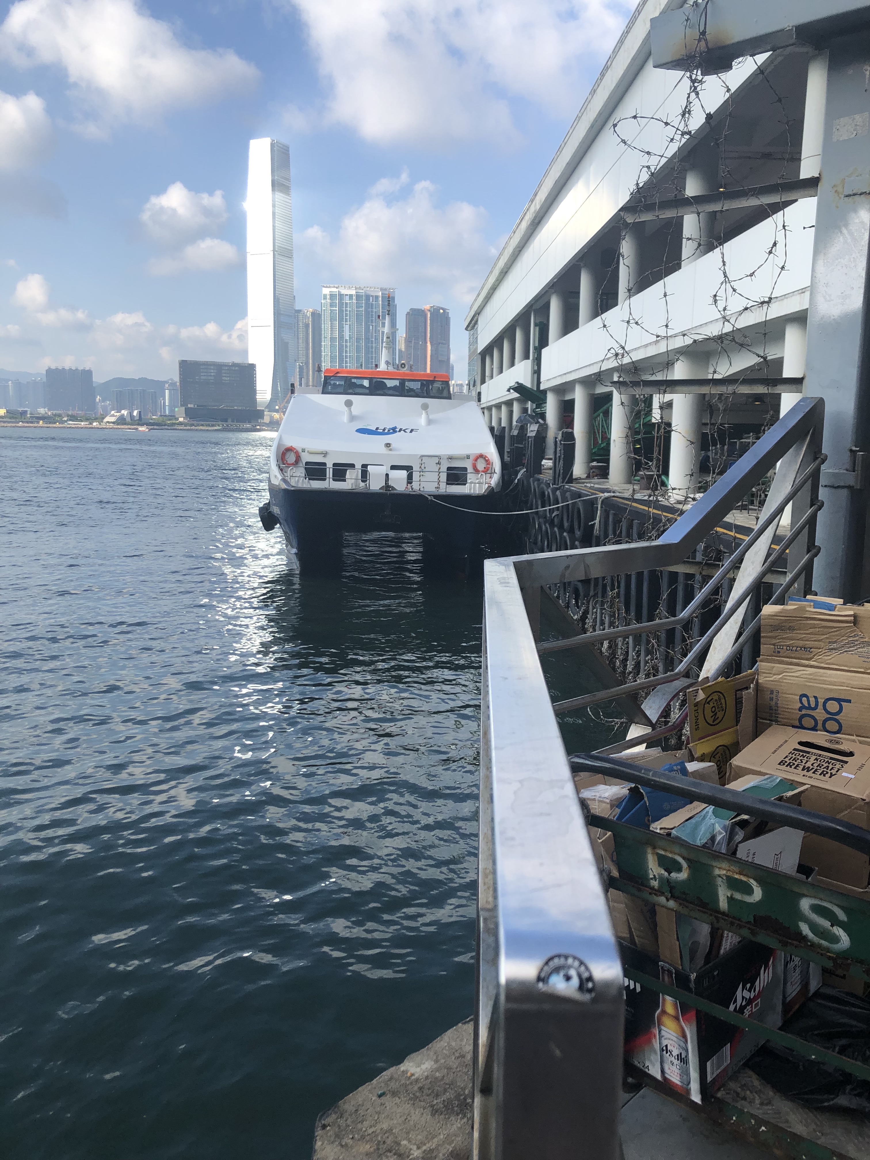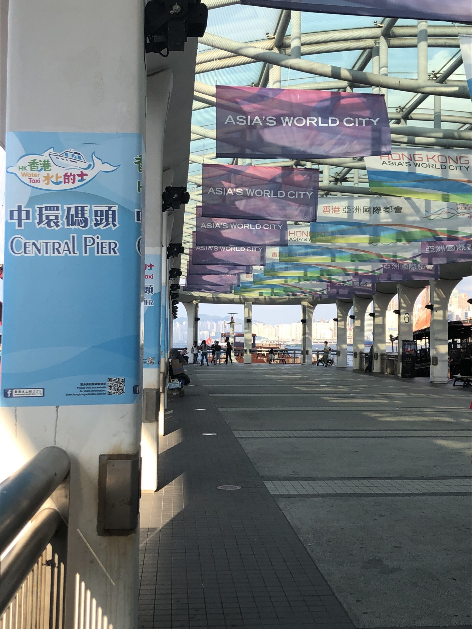 If you start at the western most point of the Central Pier in Hong Kong, you’ll first see a Central Government pier with a fenced off boat and a gated parking lot. As you head east along the piers, you’ll see people lounging on the steps, families walking by with their children and standard-looking ferries with muted colors sitting on the docks. If you look down into the water, you’ll likely see trash floating up, and there will be discarded boxes and barbed wire fence lined up along your view to the boats.