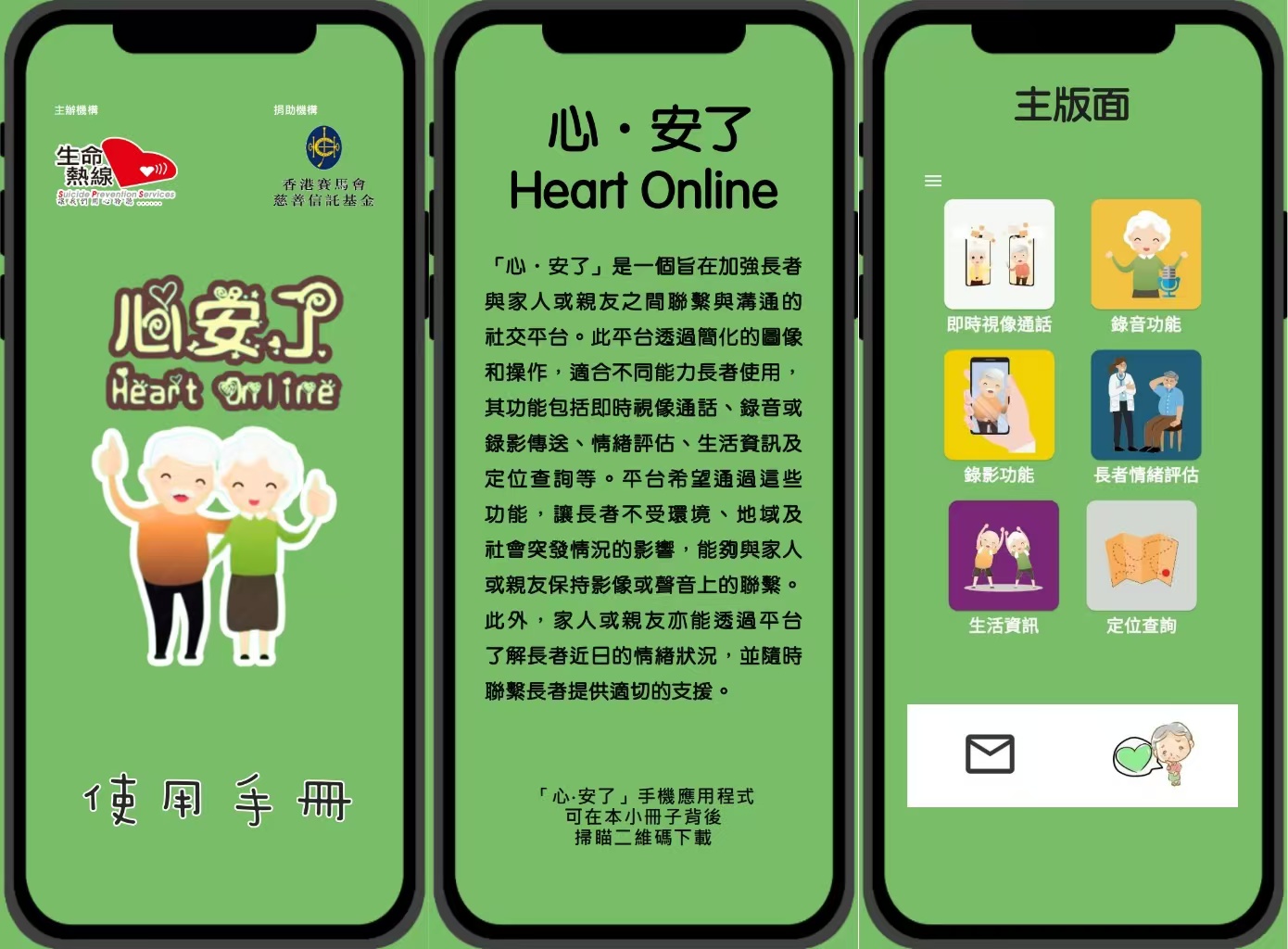 In response to the estrangement of elderly from their families or impact of emigration, Suicide Prevention Services developed a mobile application called Heart Online, hoping the elderly can stay more connected with their family and friends. Its functions include instant video calls, emotion assessment, life information, location inquiry, and more.