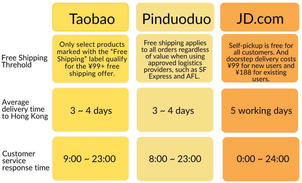 Taobao, a prominent Chinese e-commerce platform under Alibaba, announced its market expansion to Hong Kong in 2024 by introducing a free shipping service to the city. The other two major mainland e-commerce giants, Pinduoduo and JD.com, have also quickly followed suit by introducing free shipping to Hong Kong services to seize the Hong Kong market.