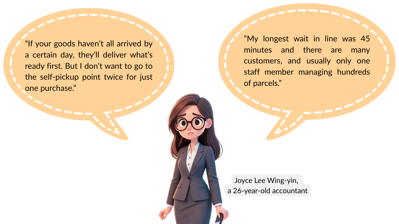 Her experience shows a common complaint among Hong Kong consumers: limited control over delivery timing and crowding at self-pickup points.